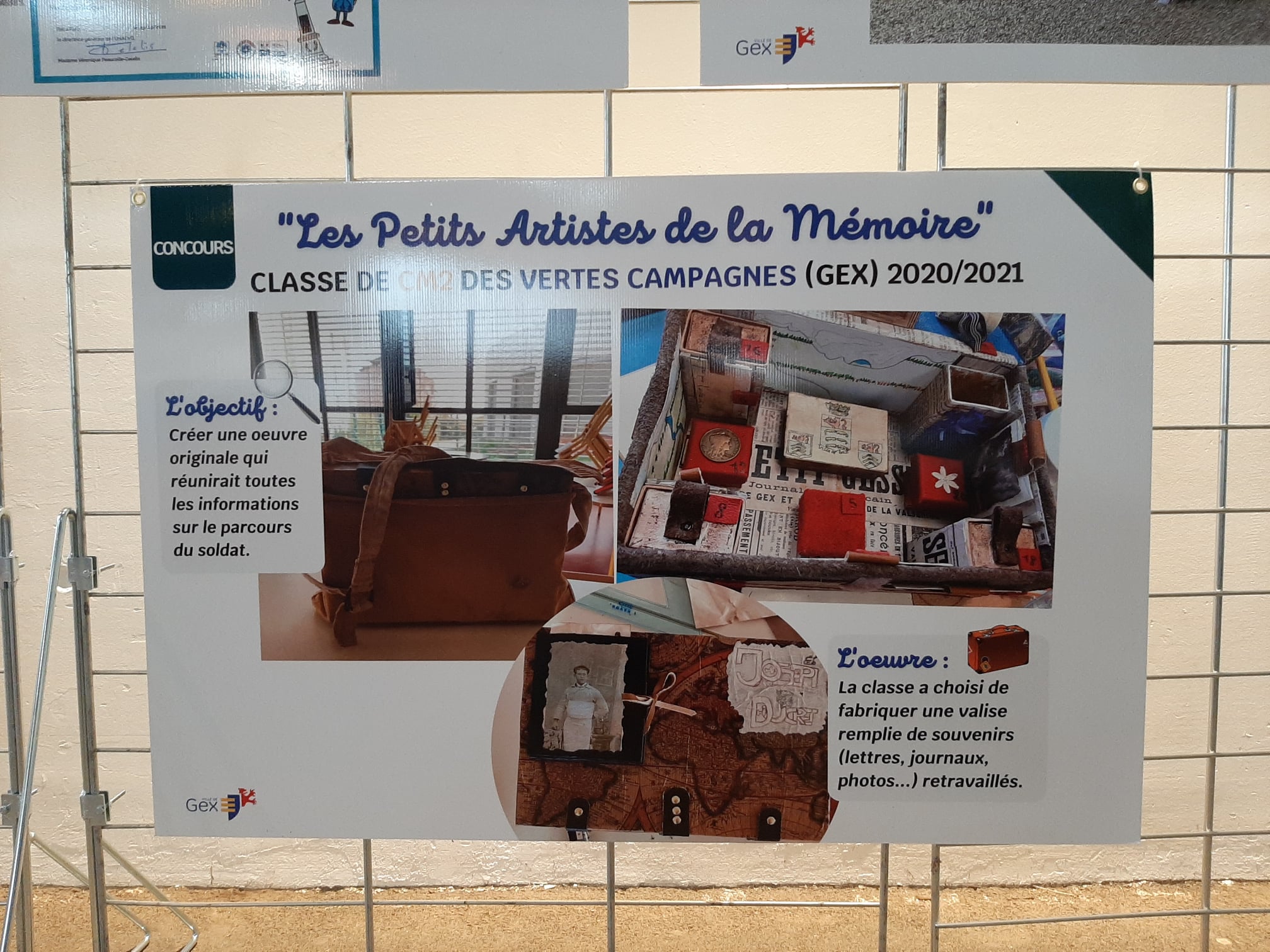 Jean-Philippe BAILLY, responsable du centre de loisirs, a lui-même contribué au projet en tant que passionné d’histoire. Il a amené des objets, livres et ressources du soldat. La petite-fille de ce dernier, Mme COURET, l’a d’ailleurs autorisé à exploiter ses archives et ses souvenirs. Des interventions ont également été menées régulièrement dans la classe afin d’échanger sur l’époque 14/18 et sur le parcours du soldat. Les élèves se sont montrés curieux et très motivés lors des échanges. Parallèlement, leur maitresse, Mme BESSON-BRABANT, a travaillé sur le projet tout au long de l’année afin de réaliser les écrits et autres travaux. Sarah et Nadège, les animatrices du centre, ont réalisé un gros travail d’art plastique avec les élèves pour créer les différents supports (bonnet de bébé brodé, travail sur le cuir, pop up, boites, peinture…) et également sur la confection de la boite/valise regroupant l’ensemble des réalisations (photos ci-jointes).